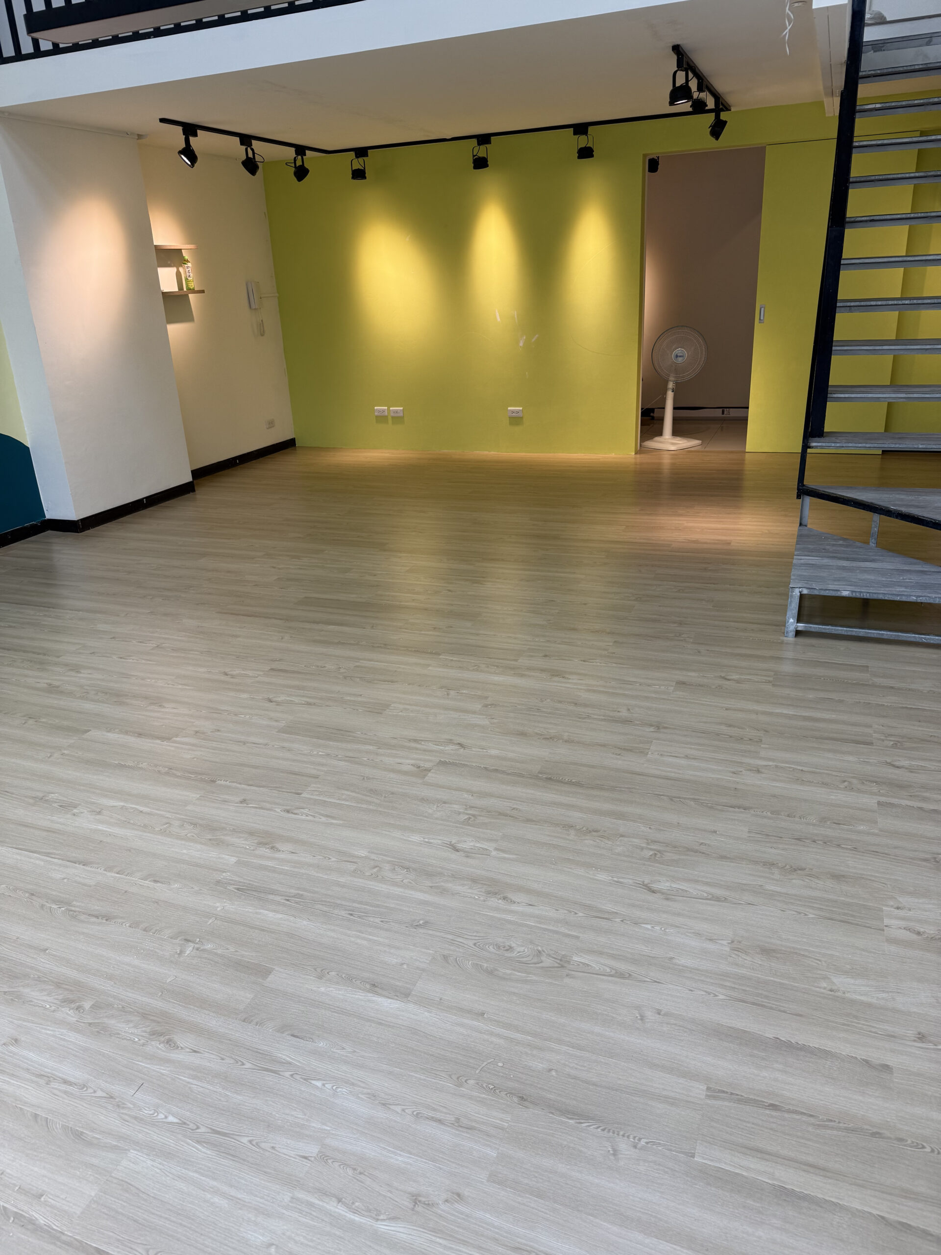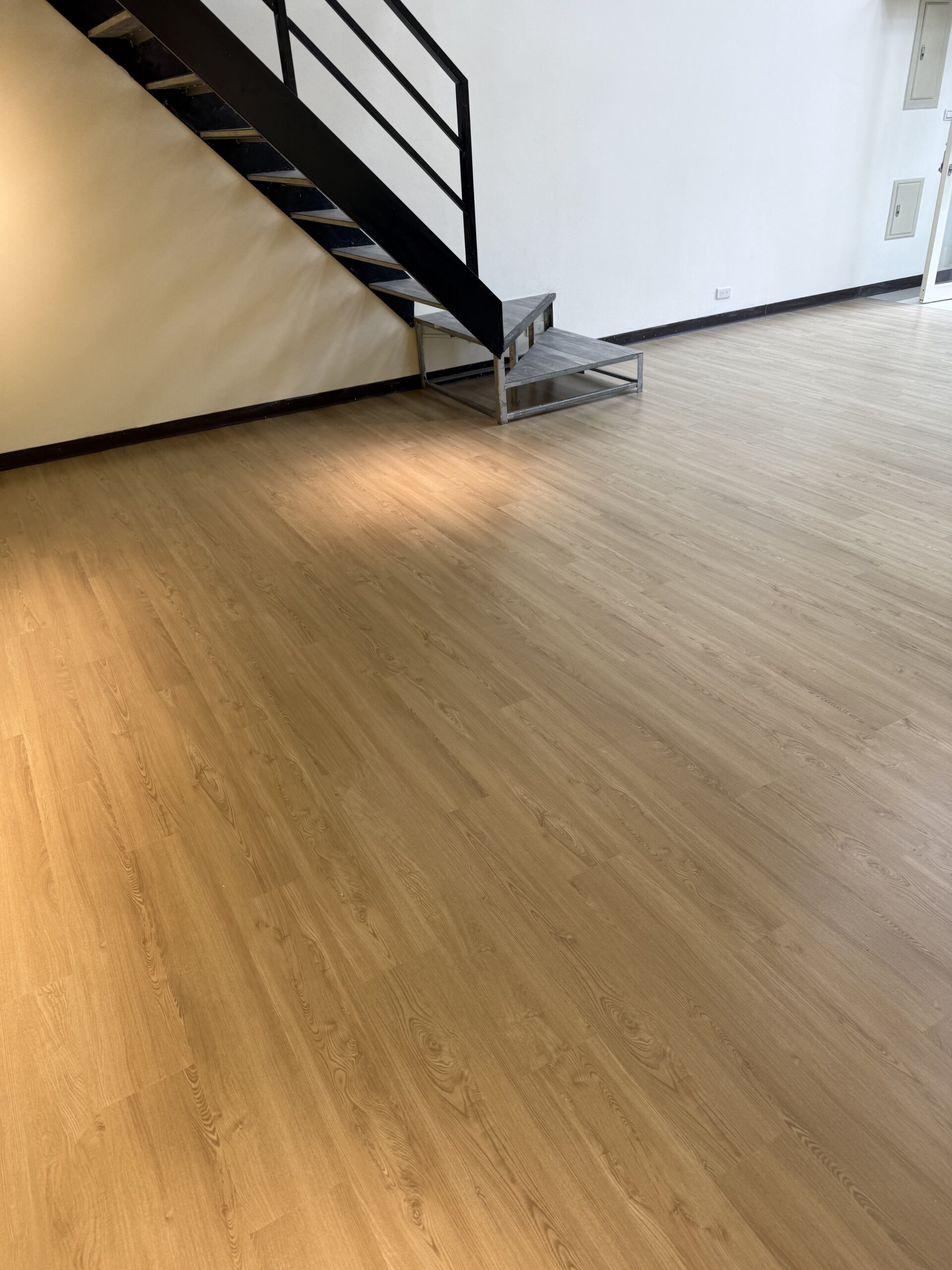 台中商業空間地板施工案例分享,本案選用暖木色木紋地板,搭配挑高空間與大片落地窗自然採光,讓整體環境呈現明亮且溫潤的質感氛圍。木紋地板不僅提升空間整體質感,也讓商業空間更加舒適耐看,是店面與工作室常見的地板選擇。