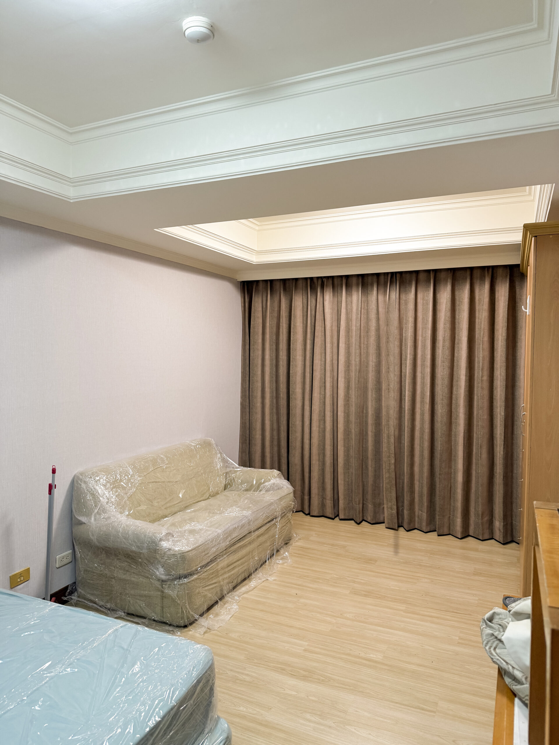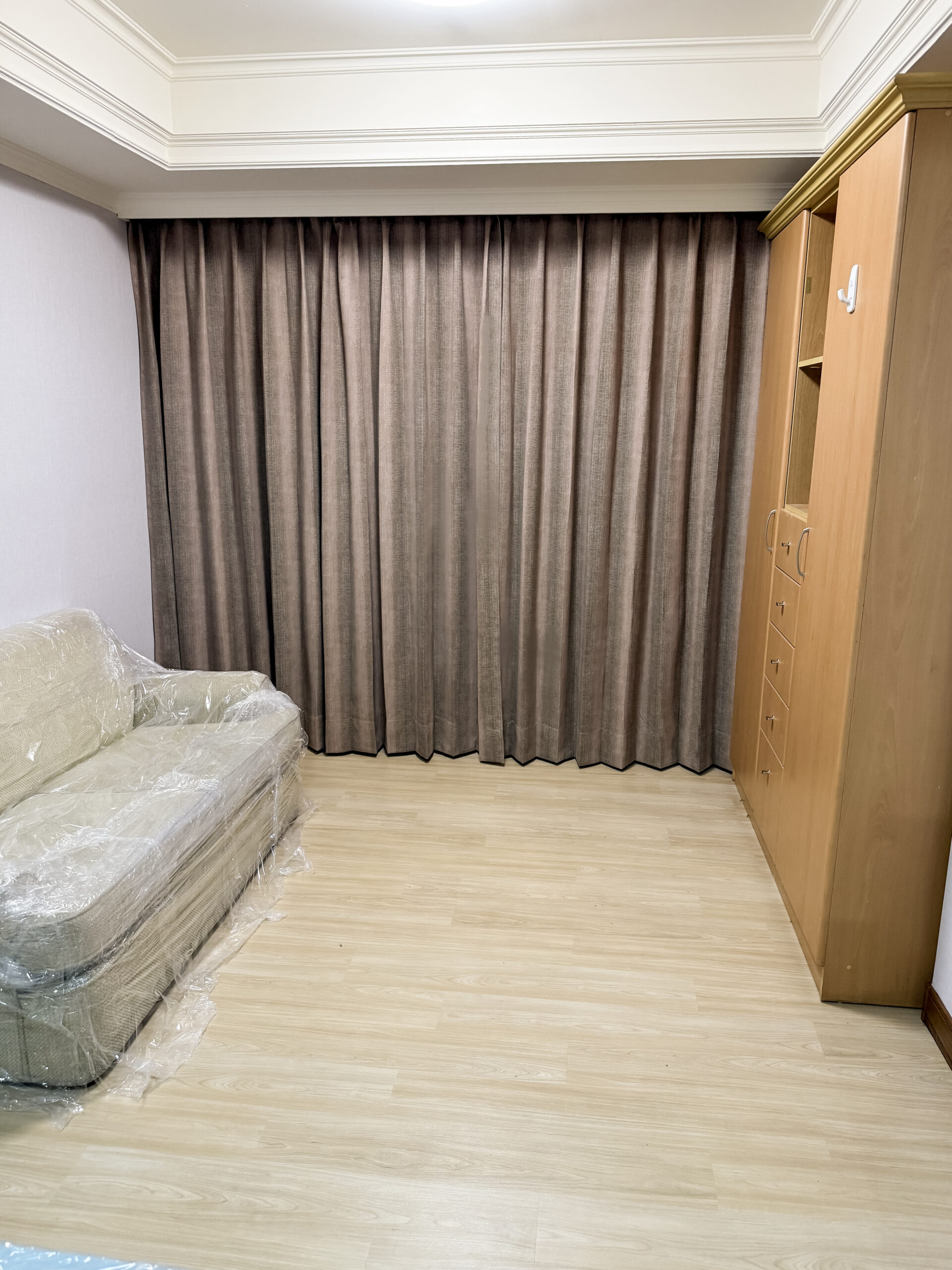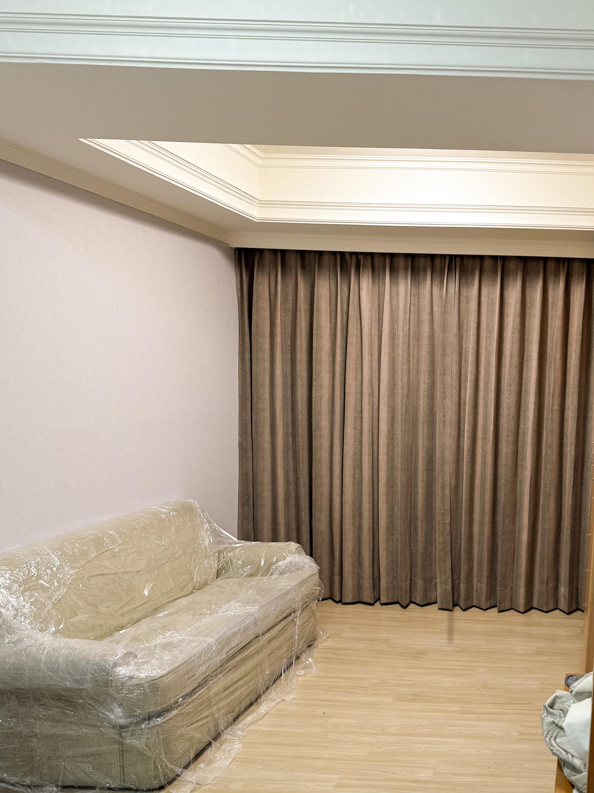 搭配奶茶色塑膠地板與可可色布簾施工
